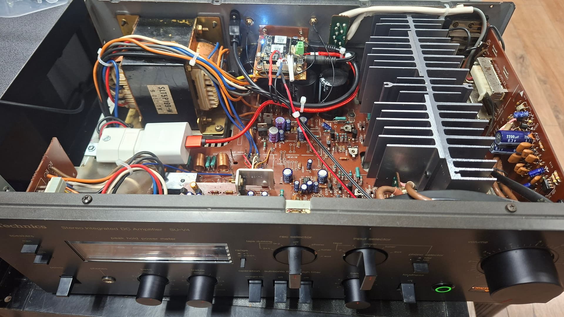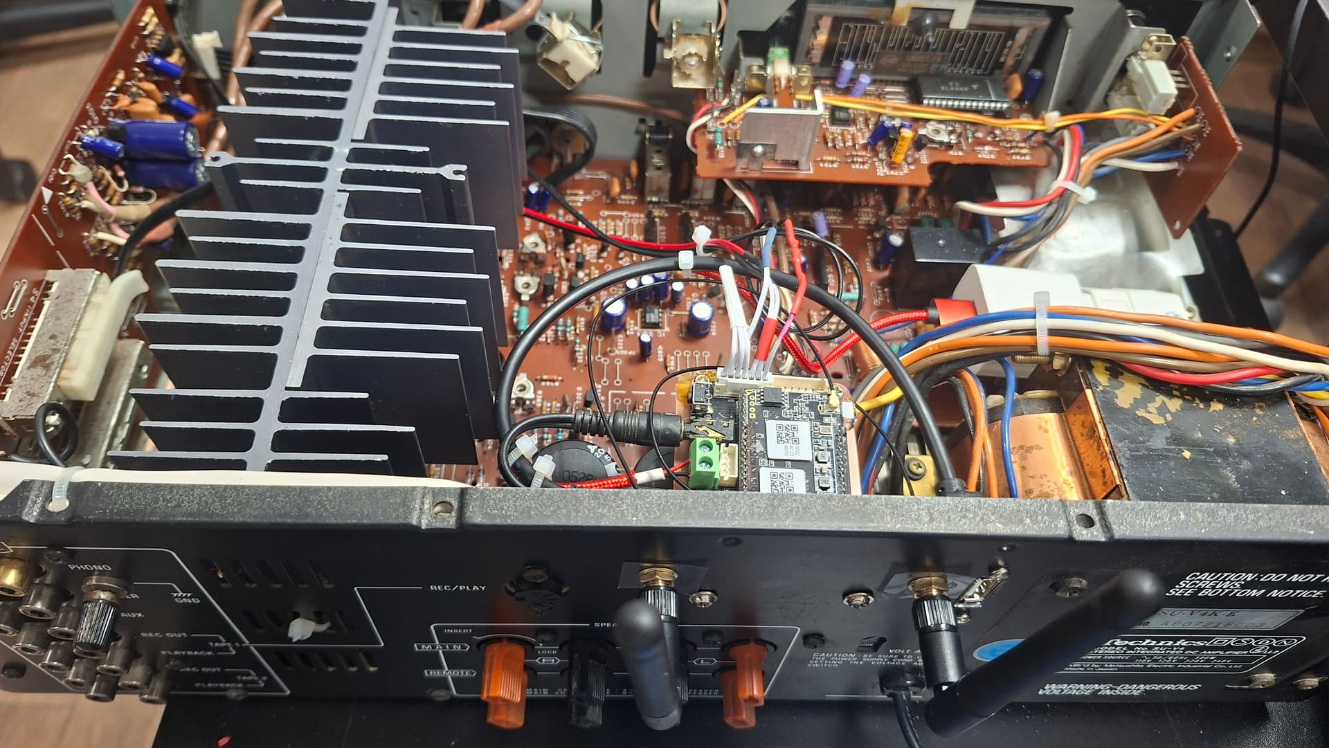 Hello! I wanted to give a try on the little up2stream mini to see it is suitable for my needs. So far so good, with a lot of goods and few bads. My experience starts with a long wait shipping but i’m over it. It arrived with upper board not inserted all the way in in one side, resolving with cleaning yellow glue and pushed in. Not a big deal. For power i choose to use a 1.5amp charger from an old phone connected to the main switch, in order to separate power source from the amp. I separated all ground and chassy from board not to encounter future noises. A otg usb was mounted on the back panel. External antennas used because amp metal case shielding. I also isolated antennas from chasis ground to avoid trouble. Momentarly push button with led lights was mounted on front panel. I was sloppy not to read with attention the schematics and resulting to order button with 3 color leds with common cathode. So now only a green light led is operating when in wifi mode, in bluetooth mode button is not lighted. I ordered already a new button with common anode leds. After a few hours of drilling, fabbing and wiring, i finally smiled satisfied. The sound are good, without hums or other noises, the app is easy to setup and use. I am glad to give a new live to this old amp.